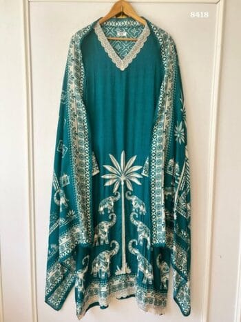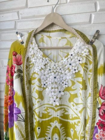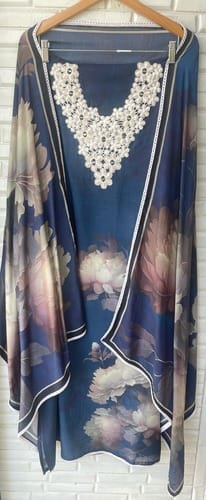 - Muslin printed fabric unstitched shirt with mirror work highlighting and crosia lace $90.00