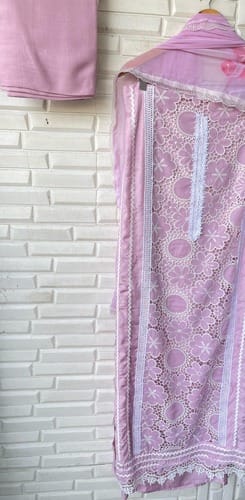 Muslin printed fabric unstitched shirt with swarowski mirror work highlighting and crosia lace