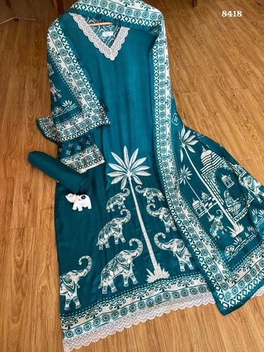 Muslin printed fabric unstitched shirt with swarowski mirror work highlighting and crosia lace